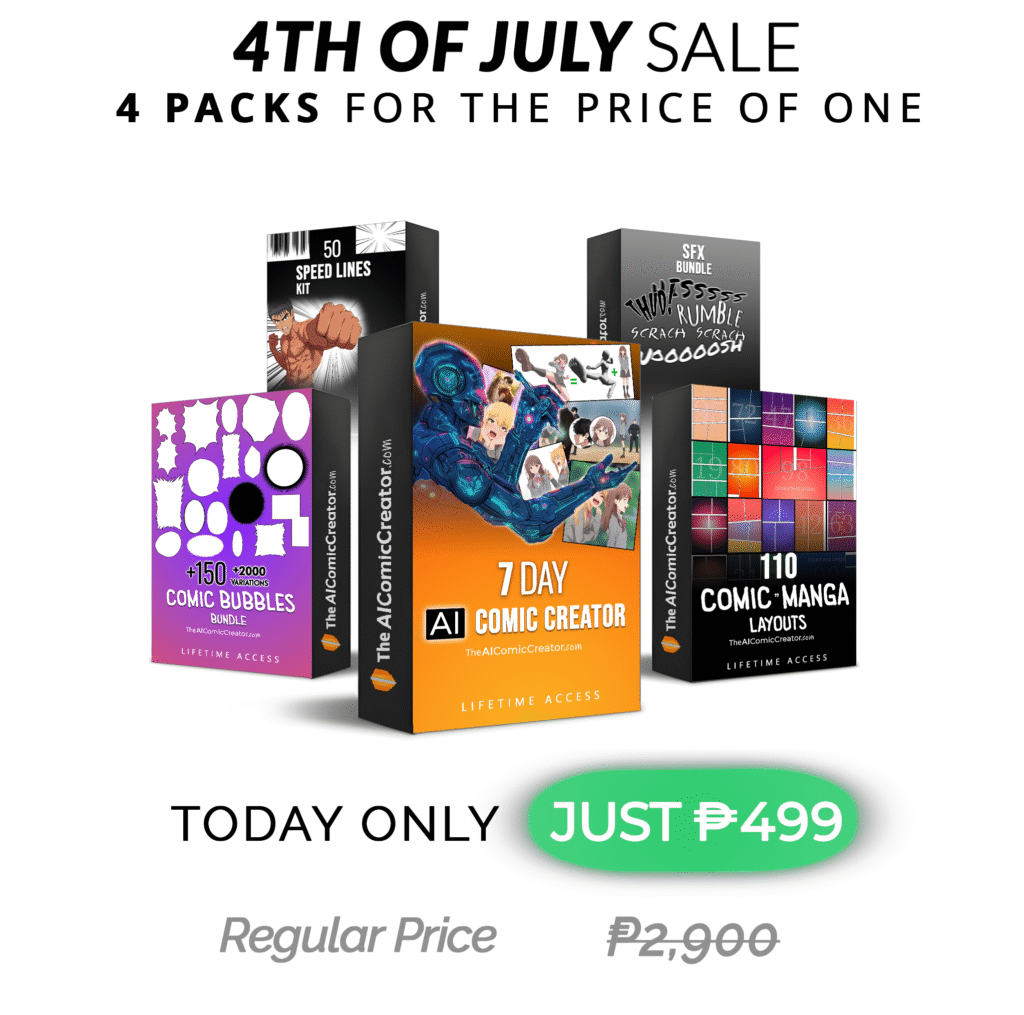 Right now, you can get the AI Comic Creator Course, plus 4 additional Comic Packs (The Layouts, The Bubbles, The Lines & The VFX) — all for a one-time payment of just ₱499 instead of ₱2900  (that’s 83% off 😱 ).